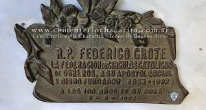 En el panteón del Circulo Católico de Obreros en el Cementerio de la Chacarita, a la derecha del altar de la capilla, descansa el Padre Federico Grote, quien debía hacer, según él, algo sencillo: poner en marcha un Círculo de Obreros como los de Europa pero adaptado al ambiente en el que estaba. Debía tener una gran amplitud en la admisión ...