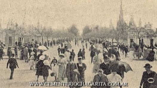 En Chacarita, por ser el más grande y popular de los cementerios la concurrencia nunca cesaba, renovándose durante todo el día, y en el extremo oeste del barrio, se había formado una vida comercial de compra y venta de artículos funerarios, como también se construían carpas y casillas de madera donde se vendían comestibles y bebidas. En bancos formados por un tablón colocado sobre trozos de madera hombres y mujeres, comen, beben, charlan, gritan y comentan alegremente las anécdotas de sus vidas, mientras siguen renovándose las masas humanas que arrojan los tranvías de la ciudad en estos parajes de tanta desolación y tristeza. Estas postales tan ambiguas, tan distintas contrastan también con el cuadro social, humildes y bien puestos penetran al sagrado recinto de la ciudad de los muertos. Ya en el interior de esas largas calles, silenciosas, llenas de recuerdos, pensamientos y sentimientos se depositan flores como ofrendas a la memoria de un padre, de una madre cariñosa, de un amigo o tal vez de un prometido. El hecho es que en ese día, todo era vida en los cementerios.