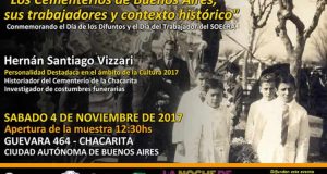 “Los Cementerios de Buenos Aires, sus trabajadores y contexto histórico” de Hernán Santiago Vizzari El sábado 4 de noviembre, a las 12:30 horas, Hernán Vizzari expondrá su muestra “Los Cementerios de Buenos Aires, sus trabajadores y contexto histórico” donde también se le hará entrega de la declaratoria oficial como «Personalidad Destacada en el ámbito de la Cultura» por la Legislatura ...