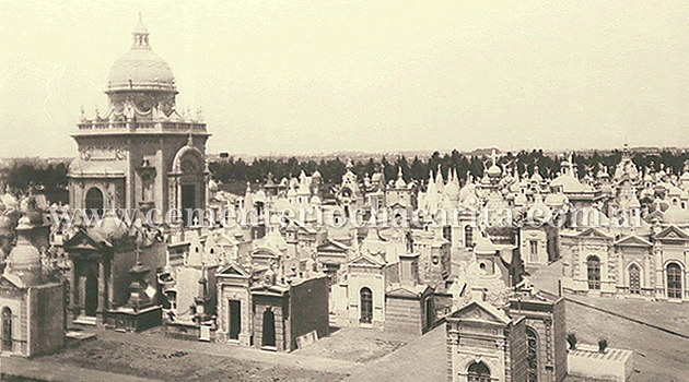 Toma aérea desde el peristilo del cementerio de la chacarita. Vemos una importante cantidad de bóvedas, parcelas sin construcción y detrás el Panteón Español de Socorros Mutuos. Esta fotografía es de 1903 apróximadamente.