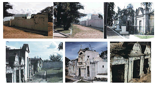 Sobre la calle de acceso desde el portón principal hacia la cruz mayor, y en torno a esta ultima, se encontraban los panteones de la principales familias de la ciudad.