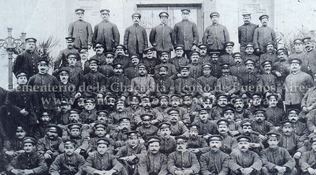 Fotografía de unos 100 empleados del Cementerio de la Chacarita con sus uniformes reglamentarios, donde se encuentra entre ellos Domingo Callegari, abuelo del propietario de esta foto, el señor Horacio Callegari.