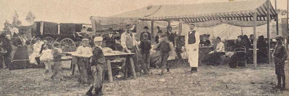Curiosa postal del un día de los difuntos en la Chacarita. Se estilaba poner un Gazebo con comida fuera del cementerio, ya que los deudos pasaban todo el día en el mismo colocando arreglos florares, emprolijando las sepulturas entre otras cosas.